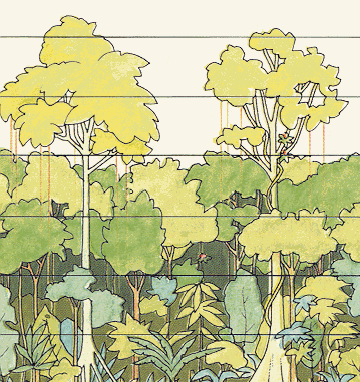 Kronendach: Die Baumkronen des Urwaldes bilden zwischen 30 Meter und 40 Meter das Kronendach. Das Kronendach ist ein geschlossenes Blätterdach und verhindert größtenteils den Lichteinfall in die tieferen Stockwerke des Urwaldes.